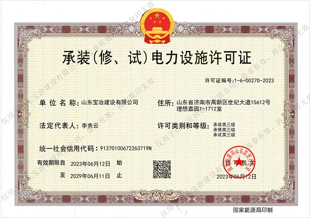 近日,公司成功取得了由國家能源局頒發(fā)的承裝(修、試)電力設施許可四級資質。